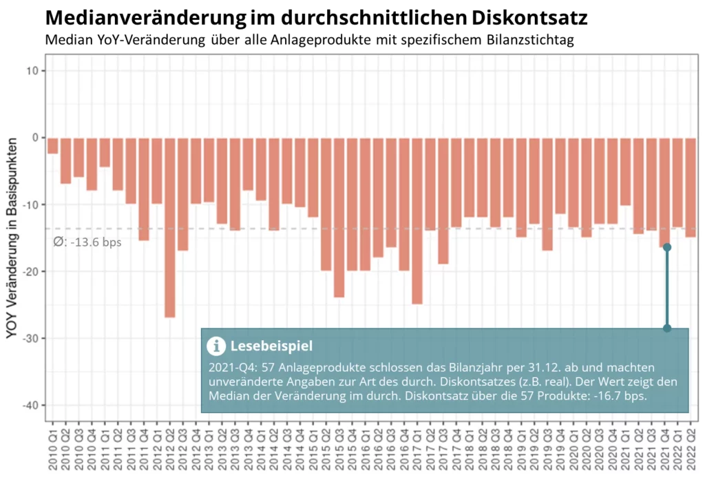 Neben der teilweise volatilen Bewertung der Anteile an der Börse interessieren sich gerade lang­fristig orientierte Investoren und Investoren von NAV-gehandelten Gefässen für die Bewertung der Objekte, welche den Net Asset Value bilden. Der von Wüest Partner erstellte Index für Wohn­rendite­liegen­schaften ging im Q2-2022 mit -1.3% leicht zurück. Über das Jahr liegt die Veränderung aber immer noch bei +0.9%. Die Port­folio­bewertungen per Ende des Geschäfts­jahres geben quartals­weise, jedoch mit 3-4 Monaten Verspätung, Einblicke in die Ent­wicklung. Die folgende Grafik zeigt die Median-Veränderung der Diskont­sätze YoY. Da die Anlage­gefässe unter­schiedliche Bilanz­stichtage haben, lässt sich die Grafik quartals­weise darstellen. Es gilt zu berück­sichtigen, dass sich die Zusammen­setzung der Produkte verändert. Die Grafik zeigt, dass trotz Zins­wende auch für Ende Q2-2022 für das Median Port­folio ein um 15 Basispunkte tieferer durch­schnitt­licher Diskont­satz als Ende Q2-2021 angewendet wurde.