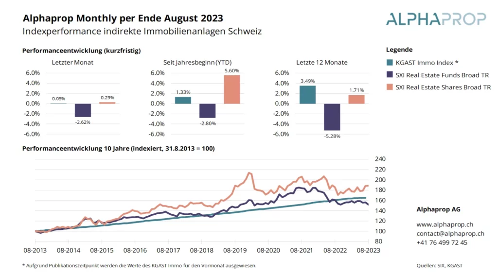 Die Marktstimmung ist weiterhin eher verhalten, was sich insbesondere in der tiefen Kapitalmarktaktivität abzeichnet. Nur wenige Gefässe wagen eine Kapitalerhöhung und schaffen es, neues Kapital aufzunehmen. Die Performance der kotierten Fonds ist weiterhin negativ für 2023. Die Aktien entwickelten sich ansprechend. Mit dem Druck auf die Bewertungen gibt es historische Bewegungen bei den KGAST Teilindizes. Während der KGAST Gesamtindex weiterhin positive Monatsperformance aufweist, mussten die Teilindizes in den letzten Monaten erste negative Werte aufweisen, was ein historisches Novum ist (die Zeitreihe der Teilindizes existiert seit Ende 2011).