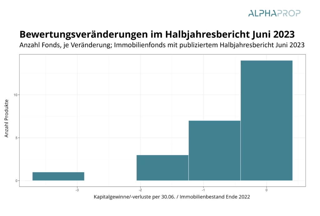 Die Halbjahresberichte der Immobilienfonds und kotierten Immobiliengesellschaften per 30.06. geben zeitnahere Einblicke, wie sich die Portfoliobewertungen entwickelt haben. In der Mehrheit der Portfolios gibt es leichte Abwertungen, jedoch sind diese im tiefen Prozentbereich. Die folgende Grafik zeigt die Verteilung für 26 Immobilienfonds auf (Stand: 07.09.2023). Im Durchschnitt lag die Summe der realisierten und nicht realisierten Kapitalgewinne und -verluste im Verhältnis zum Immobilienbestand Ende 2022 bei -53 Basispunkten je Portfolio.