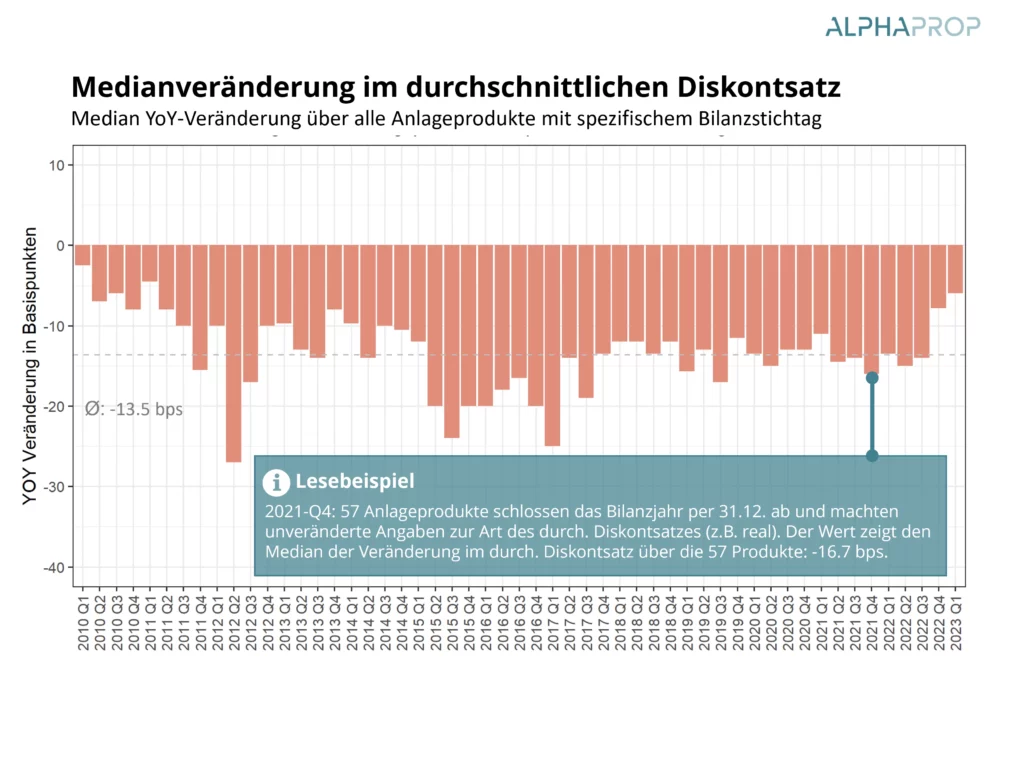 Die angewendeten realen Diskontierungssätze der publizierten Jahresberichte sind im Vergleich zum Vorjahr nochmal leicht gesunken. Die in der Bewertung angewendete Inflationserwartung, die sich im Unterschied zwischen dem realen und dem nominalen Diskontierungssatz widerspiegelt, wurde in vielen Fällen im Vergleich zum Vorjahr um 50 Basispunkte erhöht. Daher beziehen wir nur Produkte in die Analyse mit ein, für die der reale Diskontierungsatz ausgewiesen wird oder dieser hergeleitet werden kann. Im Median ist der reale Diskontierungssatz per Stichtag 31.03. um weitere 6 Basispunkte gesunken – was wohl die letzte Abnahme sein dürfte, wie die Halbjahresberichte zeigen.