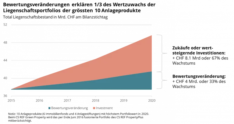 Der Marktwert der Immobilienportfolios dieser 10 Anlageprodukte lag 2020 bei knapp CHF 50 Mrd, 2015 bei CHF 38 Mrd.2 Das Volumen dieser Anlageprodukte hat während dieser fünf Jahre somit um 31% oder knapp CHF 12 Mrd. zugenommen. Ein Drittel des Wachstums entfällt dabei auf Bewertungsveränderungen (Summe aus realisierten und nicht realisierten Kapitalgewinnen/-verlusten), gut zwei Drittel des Wachstums wurden über Zukäufe oder wertsteigernde Investitionen in das bestehende Portfolio erzielt.
