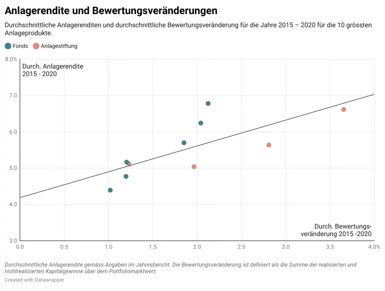 Die durchschnittliche Anlagerendite der 10 untersuchten Anlageprodukte lag über den Zeitraum 2015 – 2020 im Schnitt bei beachtlichen 5.5%. Folgende Grafik zeigt die durchschnittliche Bewertungsveränderung und die durchschnittliche Anlagerendite dieser Produkte auf. Nicht überraschend sind diese positiv korreliert. Es zeigt sich, dass bei vielen Anlageprodukten ein beachtlicher Teil der Anlagerendite durch die Aufwertung des Portfolios erzielt wurde.