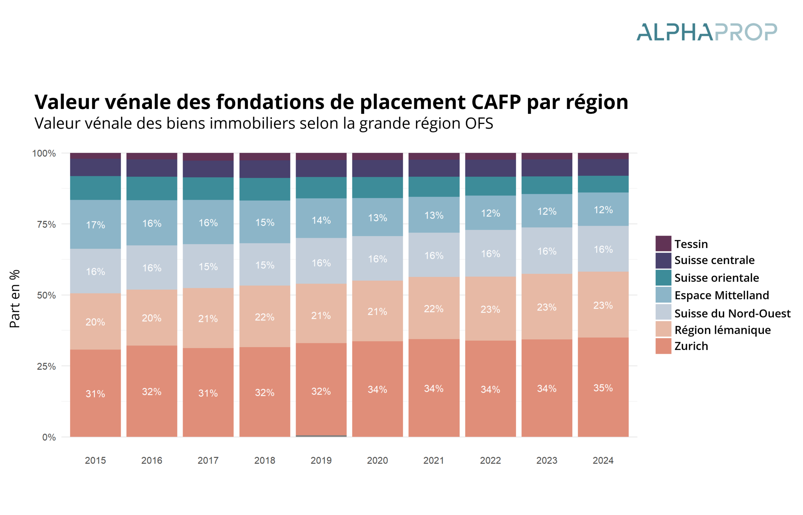 Au niveau régional, l’accent reste clairement mis sur les grands centres. La région de Zurich et la région lémanique, centres économiques puissants, concentrent la majeure partie des actifs investis. Zurich a augmenté sa part dans la valeur marchande totale des fondations de placement KGAST de 31 % (2015) à 35 % (2024), la région lémanique de 20 % (2015) à 23 % (2024). L’Espace Mittelland, en revanche, a continuellement perdu des parts entre 2015 et 2024 (-5 pp), tout comme la Suisse orientale.