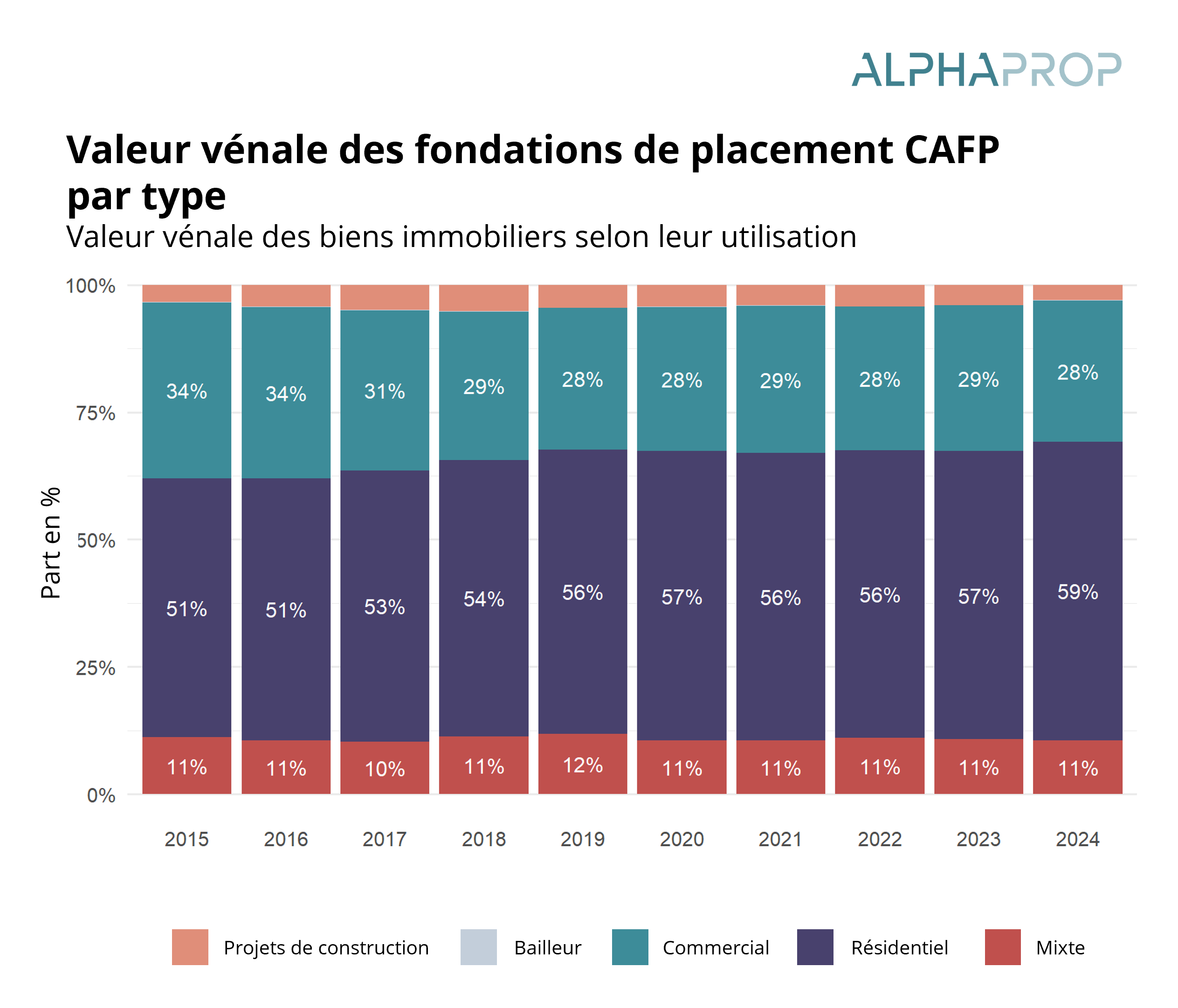 Non seulement les volumes augmentent, mais la composition des portefeuilles évolue également. La part des utilisations résidentielles dans la valeur vénale des fondations de placement CAFP n’a cessé d’augmenter ces dernières années (passant de 51 % à 59 % de la valeur vénale totale CAFP en 9 ans), tandis que les immeubles commerciaux ont perdu de leur importance (de 34 % à 28 % de la valeur vénale totale de la CAFP entre 2015 et 2024).