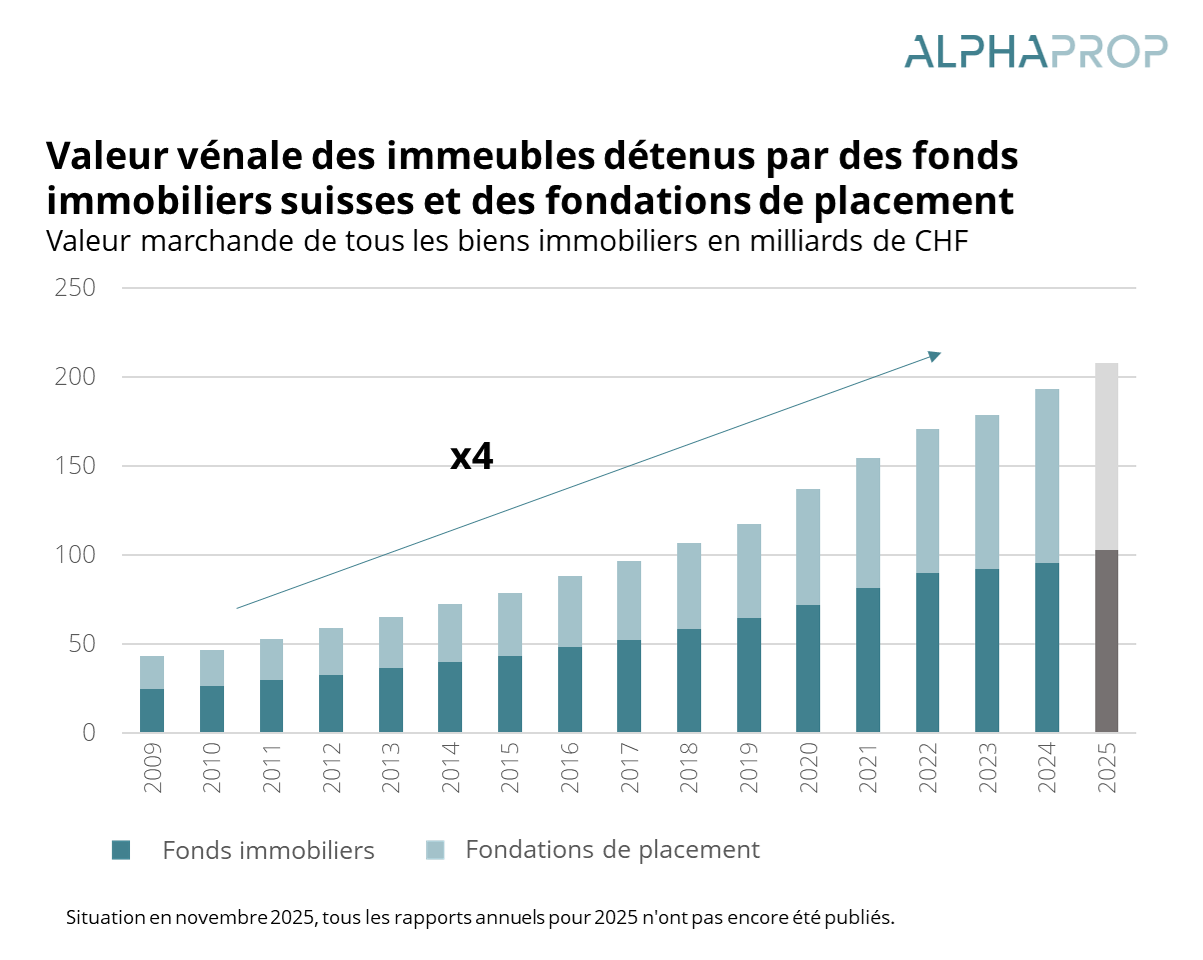 À titre de comparaison, selon les statistiques des caisses de pension de l’OFS 2024, le total du bilan des caisses de pension suisses s’élève à environ 1 222 milliards de francs, dont environ 229 milliards sont investis dans l’immobilier suisse. Environ la moitié de ce montant est détenue par des véhicules d’investissement collectifs. [1]