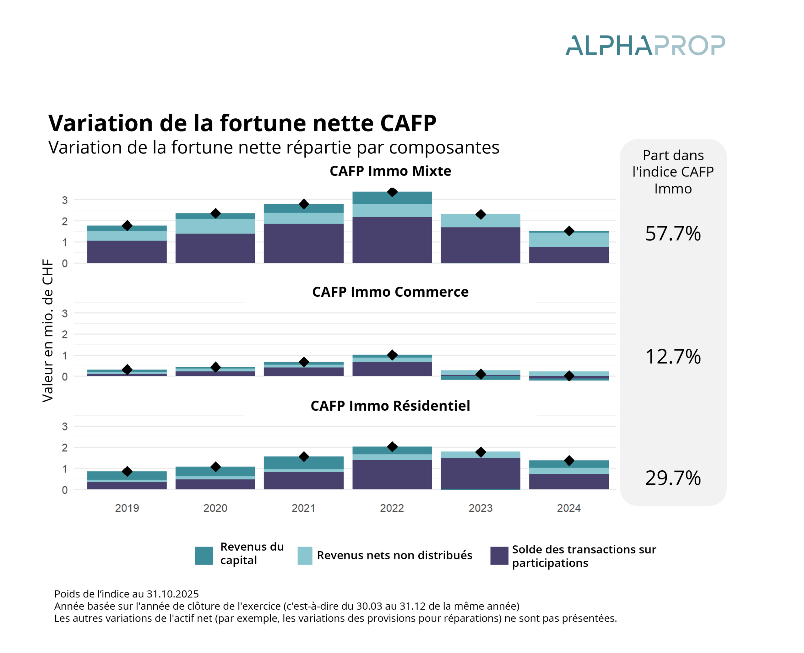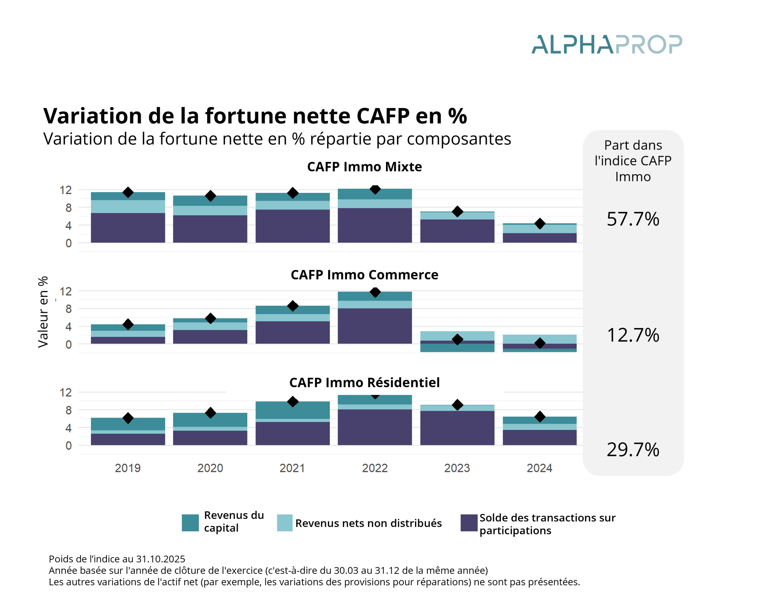 Une analyse différenciée des différents segments montre que le marché des fondations de placement CAFP ne connaît pas une évolution homogène. Alors que le segment CAFP Résidentiel continue d’afficher une croissance stable, le sous-indice Commercial est soumis à une forte pression depuis 2023. Les flux de capitaux vers ce segment ont sensiblement diminué, ce qui se reflète tant dans la croissance absolue que relative. Les portefeuilles à usage mixte occupent une position intermédiaire, mais continuent de bénéficier de la forte progression des parts résidentielles.