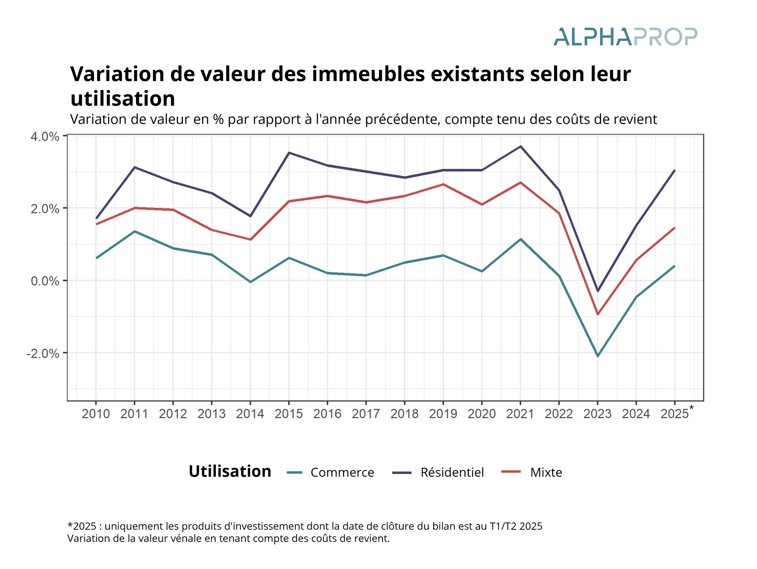 Après la baisse temporaire des évaluations en 2023, les données pour 2025 montrent à nouveau des taux de réévaluation nettement positifs dans le portefeuille. Cette évolution est particulièrement marquée dans le segment résidentiel, qui a déjà apporté la principale contribution aux gains en capital au cours des dix dernières années.