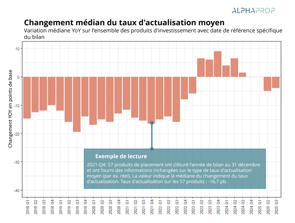Il est possible que cette évolution plutôt lente indique que les taux d’actualisation ont déjà atteint un niveau approprié après les ajustements modérés des années précédentes. La question de savoir si la légère tendance à la baisse se renforcera au cours des prochains trimestres dépendra en grande partie de la manière dont la BNS fixera ses taux d’intérêt directeurs.