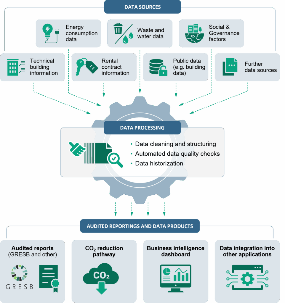 La collecte, le traitement et le reporting des données ESG pour les propriétaires immobiliers sont des tâches fastidieuses et chronophages. Grâce à une gestion efficace des données, nous automatisons votre reporting ESG : de la saisie des données au calcul des chiffres-clés souhaités.