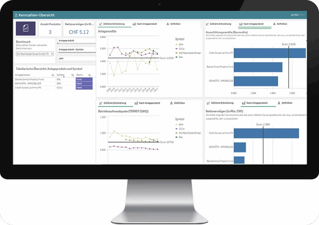 Unser umfassendes Datenportal enthält sämtliche relevanten Daten zu Immobilienfonds, Anlagestiftungen und börsenkotierten Immobiliengesellschaften aus den veröffentlichten Geschäftsberichten - zentral gebündelt und smart aufbereitet.