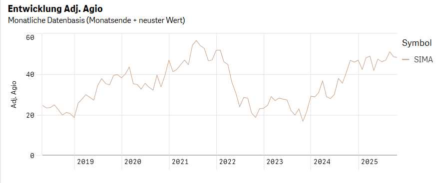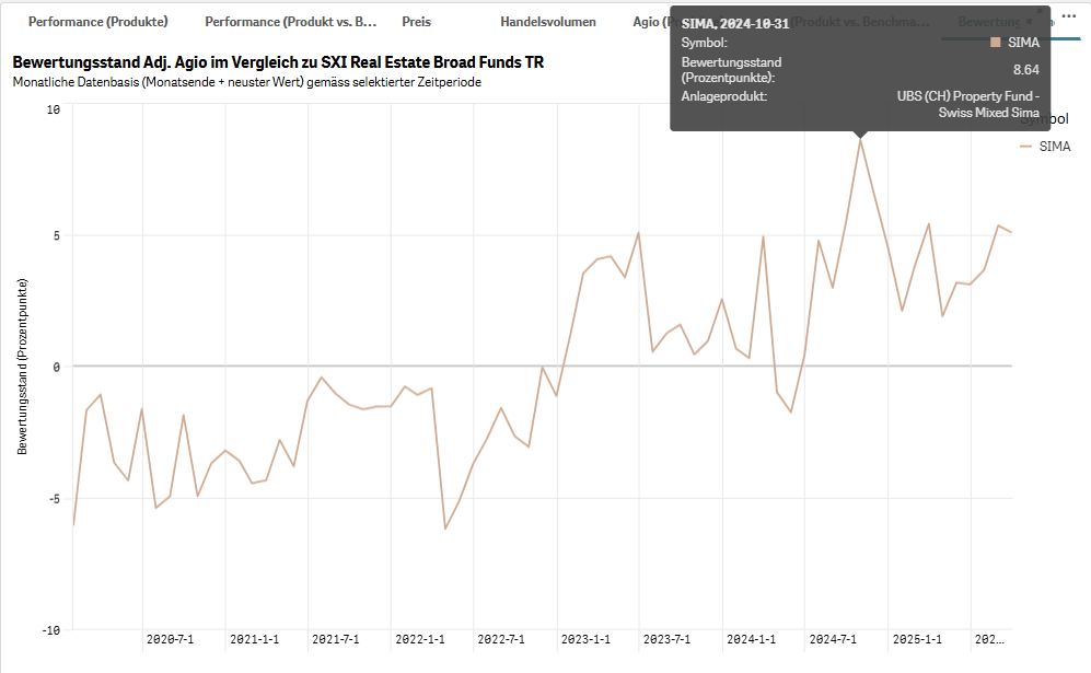 Untenstehend ist die Grafik zum Bewertungsstand des SIMA vom 31.01.2020 zum 30.09.2025 im Vergleich zum SWIIT aufgeführt. Per 31.10.2024 liegt der Bewertungsstand des SIMA im Vergleich zum SWIIT über den genannten Zeitraum bei 8.64 (siehe erste Grafik). Das bedeutet, dass das Agio dieses Produktes für dieses Datum im Vergleich zum SWIIT etwa 8.64 Prozentpunkte über der durchschnittlichen Agiodifferenz der gewählten Zeitperiode liegt. Zum Vergleich zeigt die Grafik daneben die historische Entwicklung des adjustierten Agio des SIMA und des SWIIT über den gleichen Zeitraum. Zur Veranschaulichung ist dasselbe Datum (31.10.24) markiert.