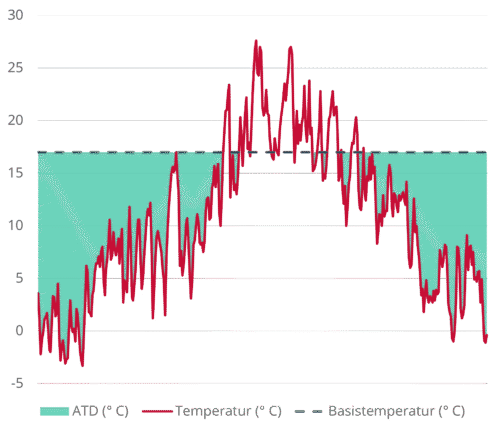 Die sogenannte Akkumulierte Temperaturdifferenz ATD (SIA 380:2022; Anhang F) gibt an, wie stark und wie lange in einer Periode geheizt werden musste. Dafür wird die Differenz zwischen der Basistemperatur und den tatsächlichen täglichen Aussentemperaturen berechnet. Positive Differenzen werden aufsummiert – je grösser die Summe, desto mehr Heizbedarf bestand in der jeweiligen Berichtsperiode.